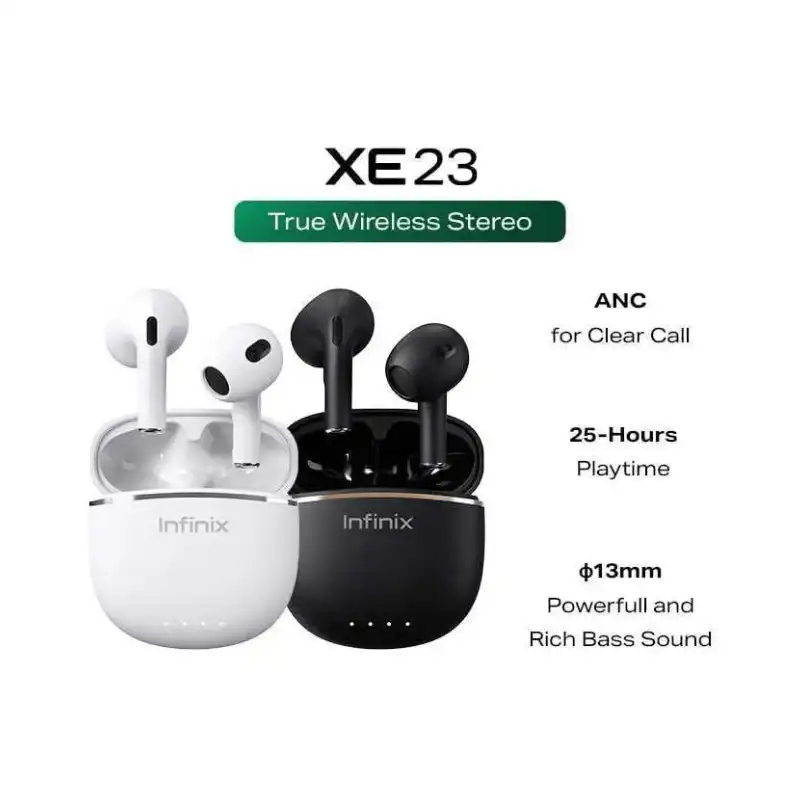 إنفينيكس بودز لايت XE23 أسود بدرايفرات ثنائية 13 مم غرافين للباس القوي والترددات العالية الصافية (20 هرتز-20 كيلو). بلوتوث 5.3 مستقر 10 متر مع اتصال فوري ووضع ألعاب تأخير منخفض؛ 4 ميكروفونات تشكيل شعاع (2 لكل سماعة) مع AI ENC لمكالمات فائقة الوضوح في البيئات الصاخبة. 40 مللي أمبير لكل سماعة 5 ساعات موسيقى (4.5 ساعة مكالمات)، 25 ساعة إجمالي بعلبة 300 مللي أمبير Type-C—10 دقائق شحن = 40 دقيقة تشغيل. IPX4 مقاومة عرق/مطر خفيف.