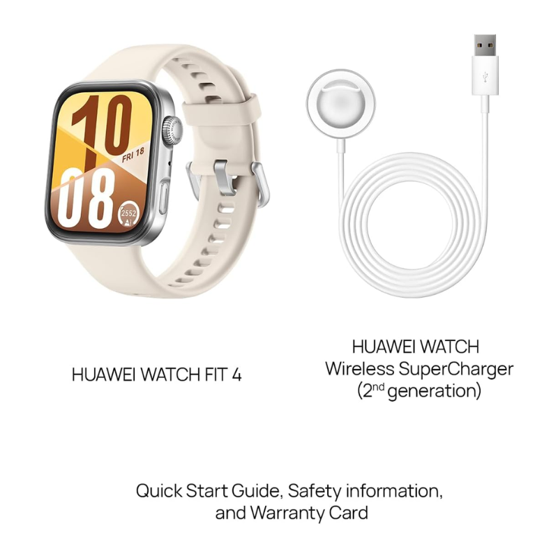ساعة هواوي واتش فيت 4 بيضاء ألمنيوم AMOLED 1.82″ 2000 نيت شمس القاهرة مع Always-On بيانات رياضية توصيل المعادي. مستشعرات نبض، SpO2، ضغط، نوم، GPS ثنائي 10 أيام بطارية عمليات طويلة.