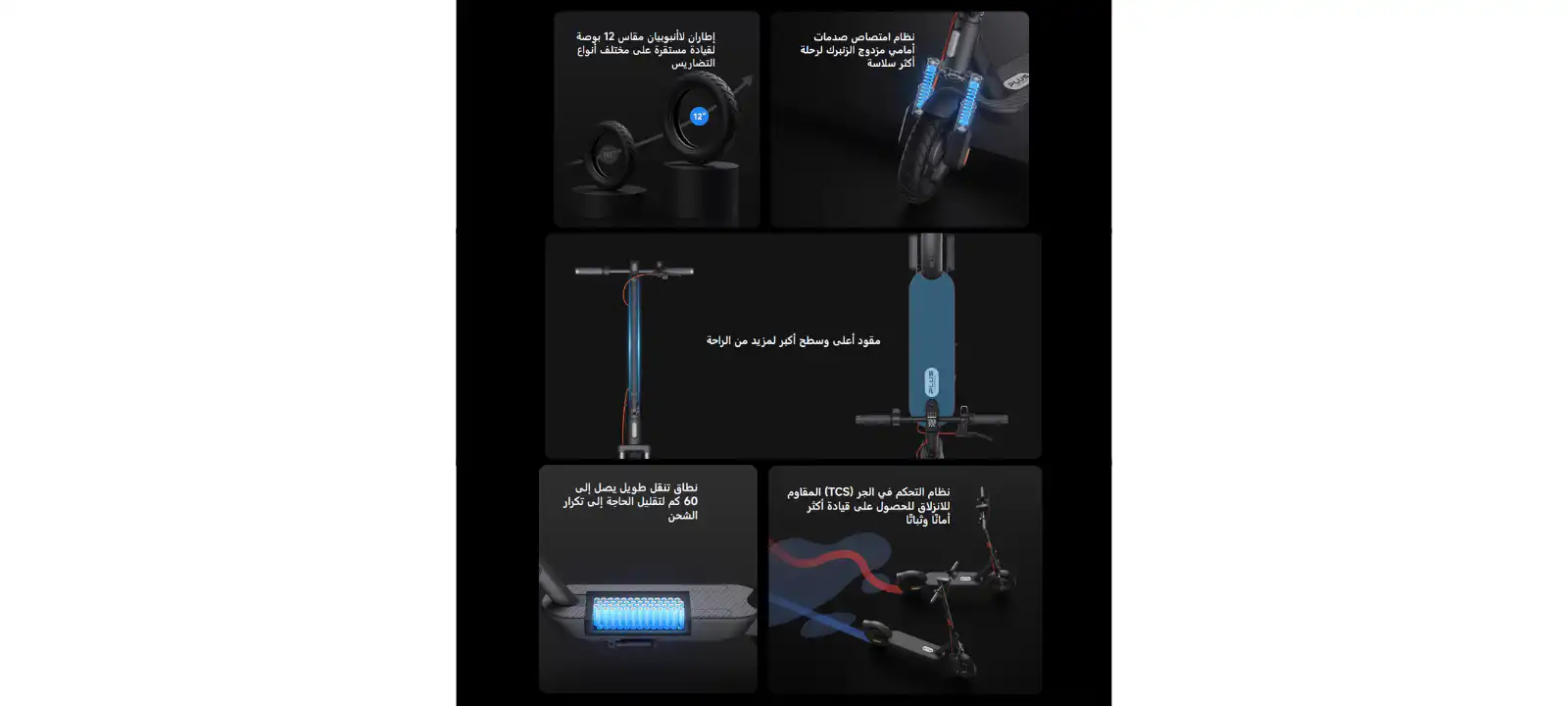 إطارات 12″: غير أنبوبية معالجة وعوائق. تعذيق ثنائي: 30 مم امتصاص يقلل الاهتزاز 25%. TCS جر: خوارزميات منع انزلاق. راحة: مقود أعلى + سطح عريض.