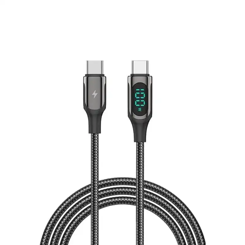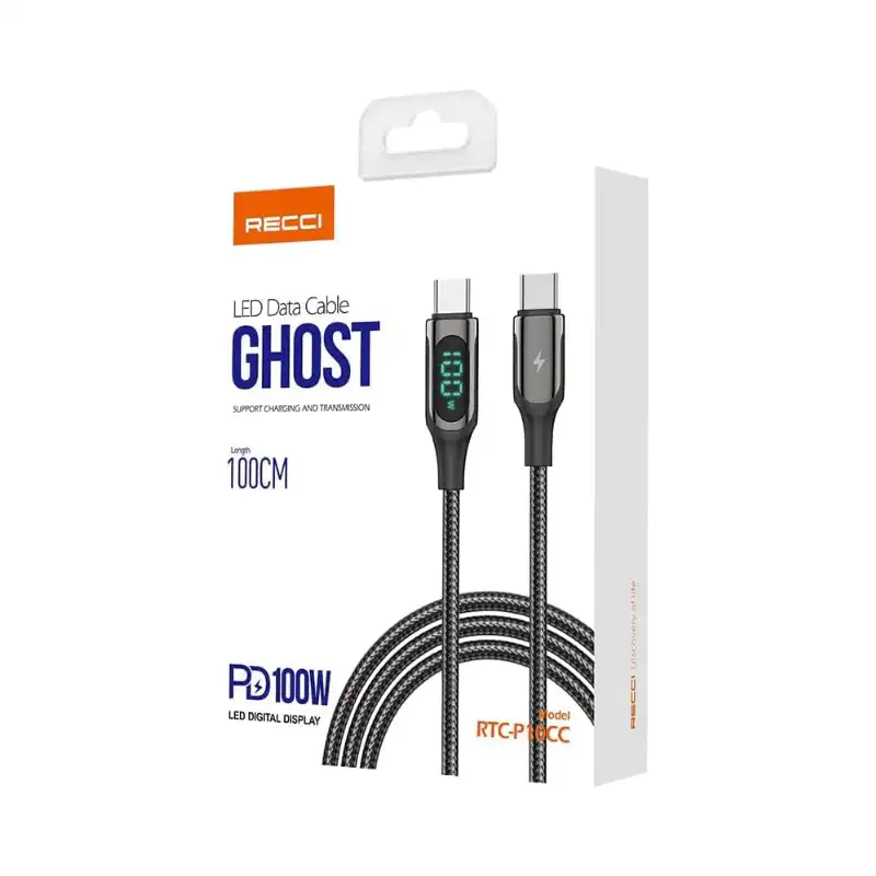 كابل ريتشي Type-C إلى Type-C 100 واط (RTC-P10CC) LED يعرض واط فوري للتحقق KS2 مع PD20W أثناء MT-330، أكثر معلومات من RS08CC. نحاس مشبك 100 واط لابتوب ريتشي مع BH-T10، حماية تمنع حرارة 45 واط. 1.2م مثالي كليب 4.