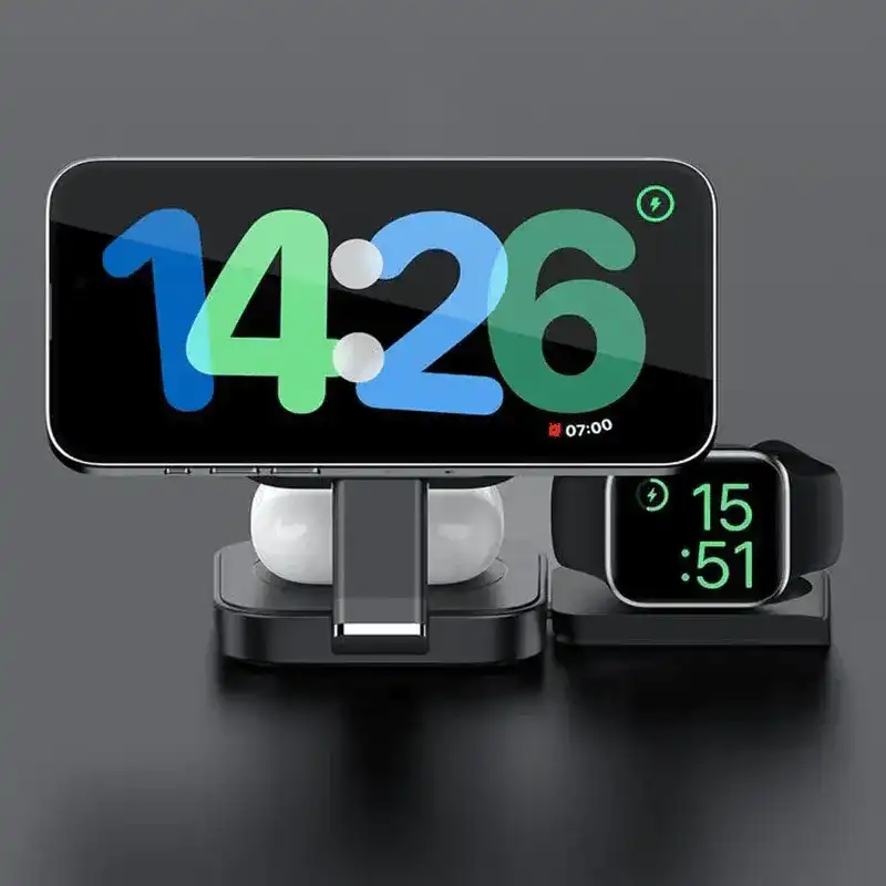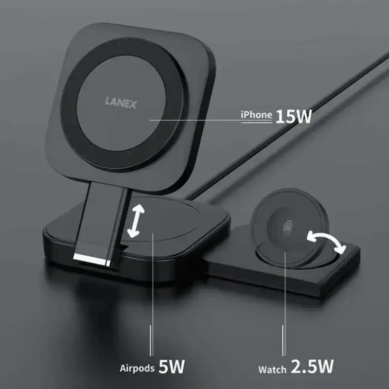 Lanex LW12 3-in-1 charging stand delivers simultaneous 15W magnetic charging for iPhone 17, 5W for AirPods, and 2.5W for Apple Watch through strong magnetic alignment ensuring perfect positioning across all three zones automatically. Adjustable stand positions phone optimally for video calls and navigation while USB-C PD input supports rapid power replenishment from any compatible wall charger. Universal Qi compatibility extends to Samsung Galaxy, Google Pixel devices while safety circuitry prevents overheating during overnight desk charging maintaining cool temperatures throughout extended sessions.