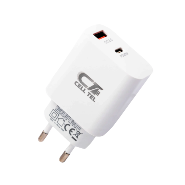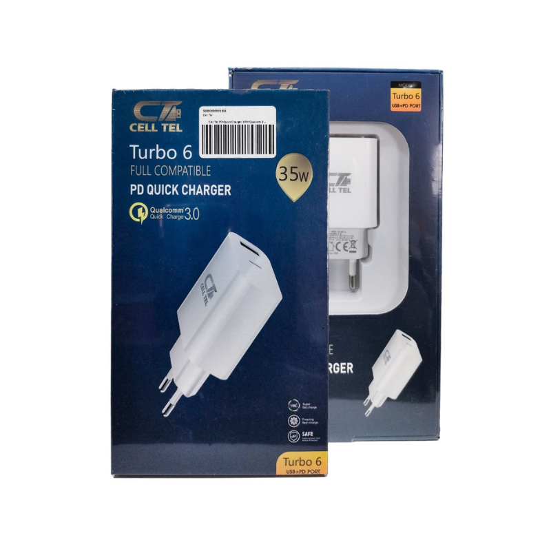 Cell Tel Turbo 6 delivers 35W PD fast charging through USB-C port reaching iPhone 17 50% in 25 minutes while QC3.0 USB-A port powers Galaxy S25 at maximum speeds with intelligent power allocation balancing dual-device charging. Universal 110-240V input supports worldwide travel without voltage converters while multi-protection system prevents overvoltage, short-circuit, and overheating damage. Compact design fits single wall sockets enabling office/home multi-charging while GaN-equivalent efficiency reduces heat generation during extended laptop/tablet sessions. Dual protocol support ensures compatibility across Apple, Samsung, Xiaomi ecosystems.