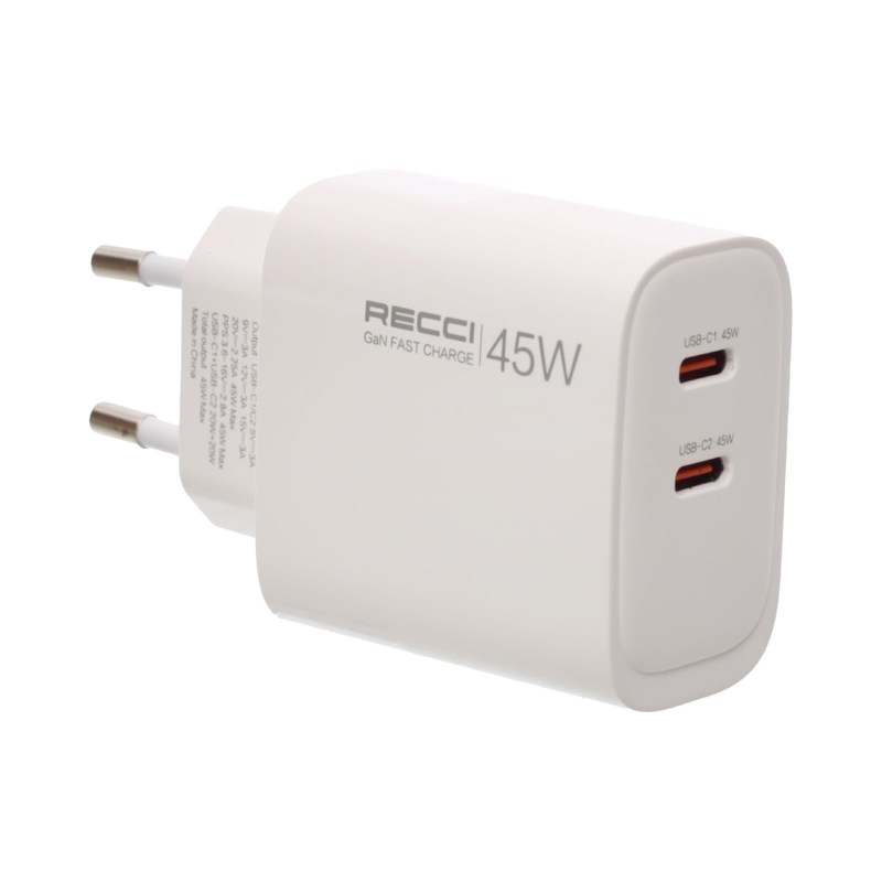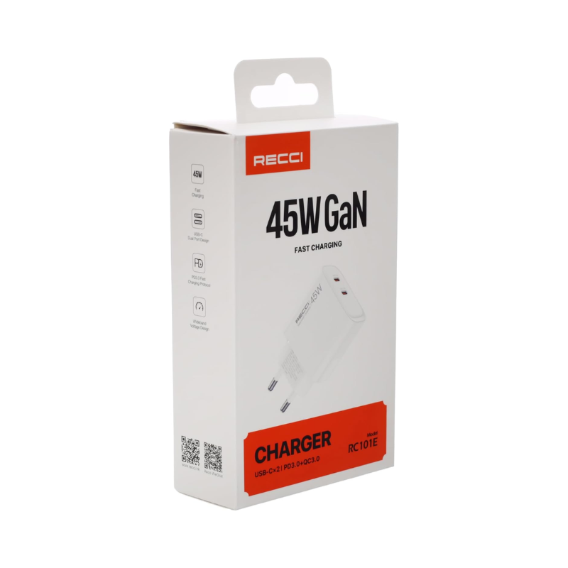 CHARGER PLUG RECCI 45W GAN (RC101E) delivers powerful dual-port GaN fast charging essential for Cairo e-commerce delivery coordinators simultaneously powering Infinix Note 50S phones and iPad tablets during intensive 12-hour routes across Egypt’s urban commerce network. Dual USB-C ports with intelligent power allocation provide 45W single port max or balanced 22.5W each while compact GaN technology reduces 50% size compared to traditional chargers for perfect delivery uniform pocket storage.