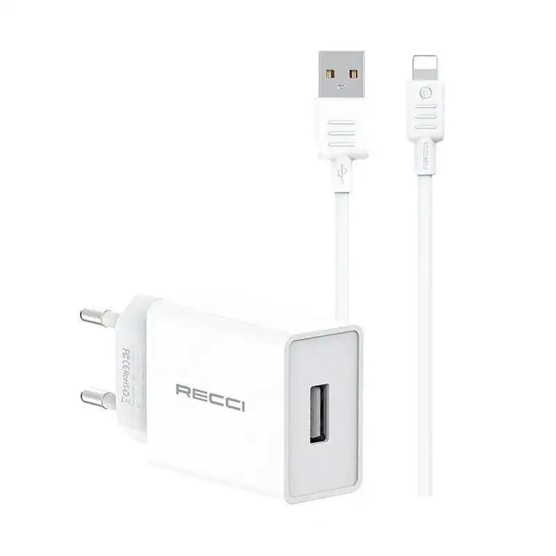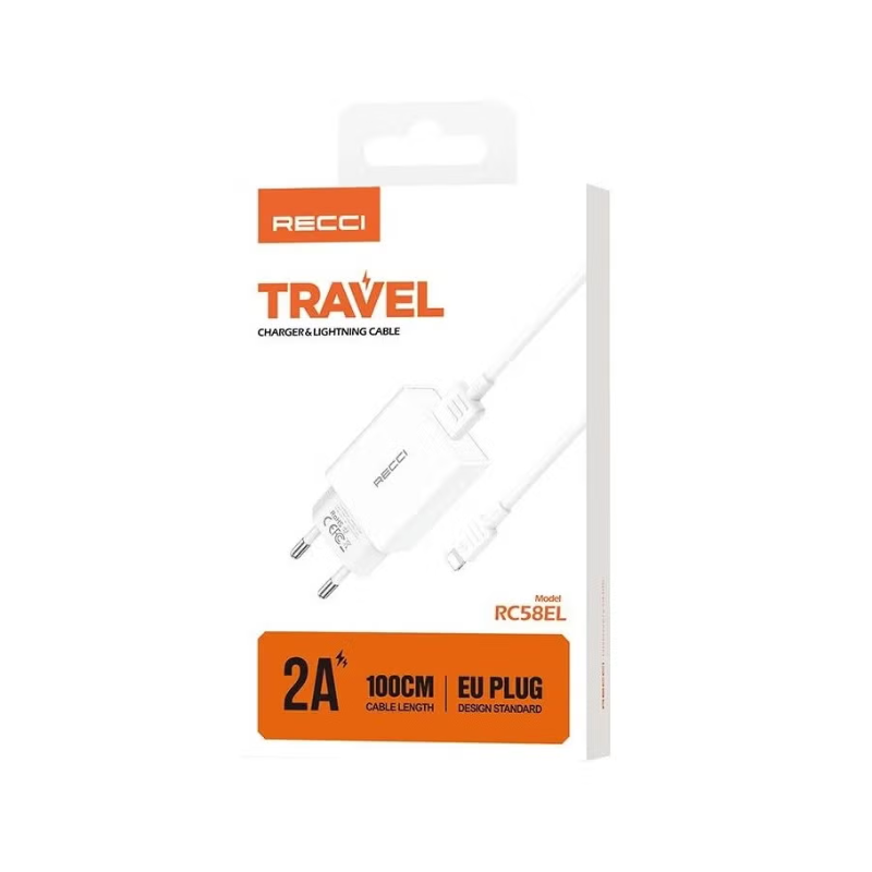 The Recci RC58EL charger comes with an integrated 100cm Lightning cable designed specifically for fast and safe charging of iPhones, iPads, and other Apple devices up to 2A output at 5V. Its compact EU plug wall adapter features a sturdy USB-A port delivering stable 10W power with universal voltage compatibility for worldwide use. Built from high-quality ABS plastic, it includes smart charging circuitry to prevent overcurrent and overheating, ensuring reliable performance for daily Apple ecosystem charging needs.