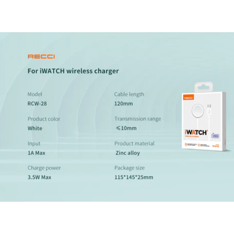 Recci RCW-28 provides 3.5W wireless magnetic charging specifically optimized for Apple Watch Series 1-9, SE, and Ultra models with precise magnetic alignment ensuring perfect coil positioning. 1.2-meter USB cable offers flexible bedside/nightstand placement while compact disc design slips easily into pockets or travel bags. Universal USB compatibility works with any 5V/1A+ wall charger, laptop USB port, or power bank maintaining stable charging current without overheating. Plug-and-play operation requires no apps or pairing maintaining Apple Watch fast charging protocol across all compatible models.