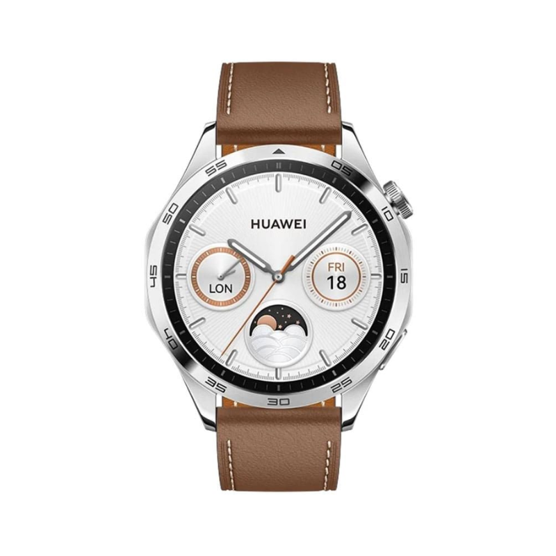 Huawei Watch GT4 Classic in elegant brown leather combines 1.43-inch AMOLED display with TruSeen 5.5+ heart rate monitoring, SpO2 tracking, stress analysis, and sleep breathing awareness for comprehensive health insights. Its 524mAh battery lasts up to 14 days typical use or 8 days heavy, powered by rotating crown navigation and built-in GPS for precise outdoor tracking across 100+ workout modes including running and cycling. 5 ATM water resistance and premium stainless steel frame with leather strap suit formal Cairo occasions while delivering Stay Fit app guidance.