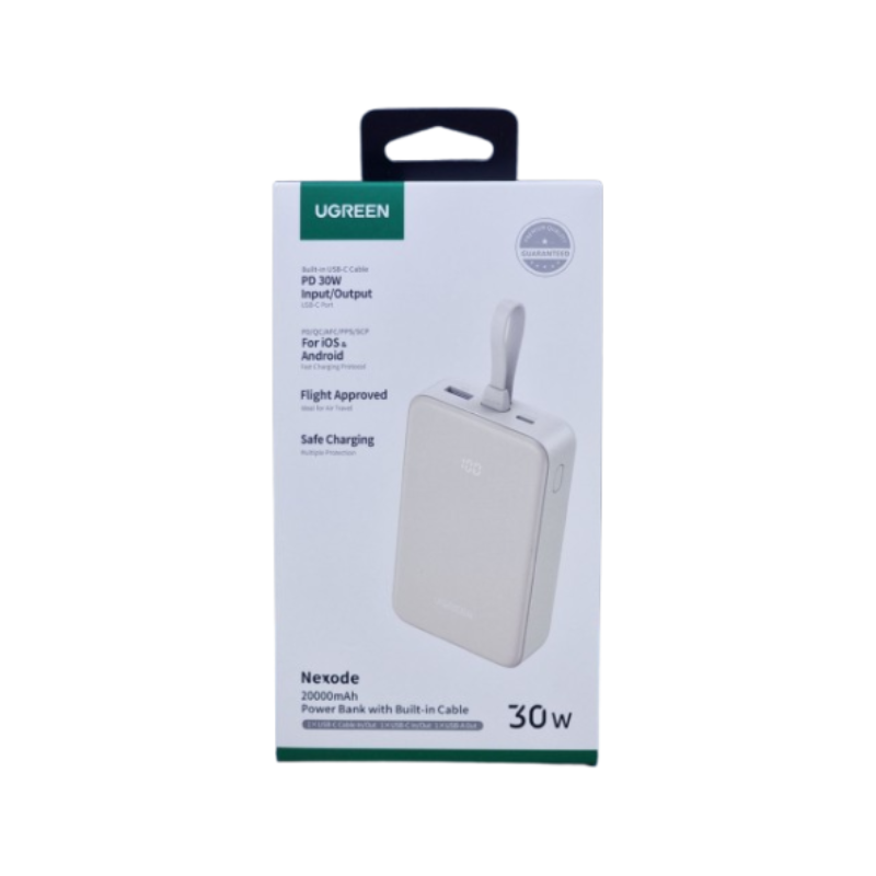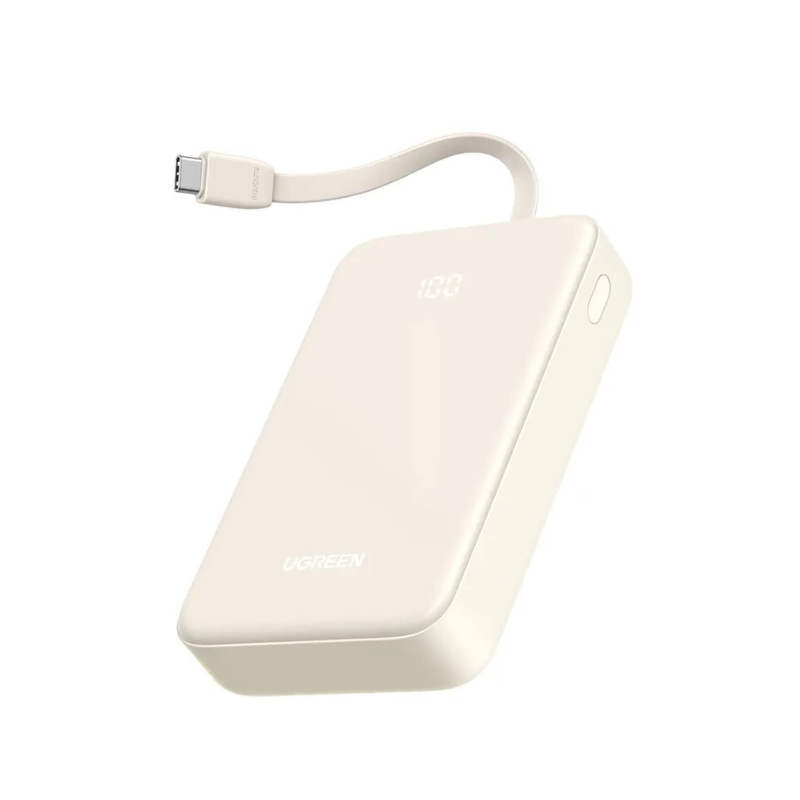 The UGREEN PB521 provides 30W fast charging via built-in USB-C cable (iPhone 16 to 60% in 30 minutes) while USB-C port delivers 30W for tablets and USB-A handles 22.5W accessories simultaneously. Total 5V/3A output supports three-device charging without cable clutter.