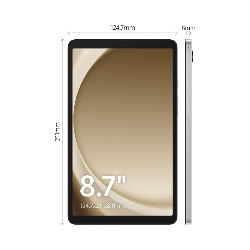 SAMSUNG TAB A9 4GB RAM 64GB Silver features MediaTek Helio G99 octa-core processor (2×2.2GHz Cortex-A76 + 6×2.0GHz A55) with Mali-G57 MC2 graphics handling streaming, web browsing, and light multitasking on bright 8.7-inch TFT display (800×1340, 179ppi, 60Hz). Expandable storage via dedicated microSDXC slot supports up to 1TB while 5100mAh battery delivers full-day usage with 15W USB-C fast charging. Dual speakers optimize Netflix/YouTube consumption; slim 8mm metal chassis in premium Silver finish weighs just 333g.