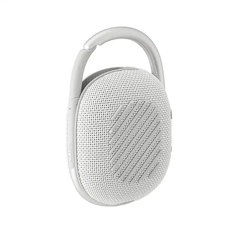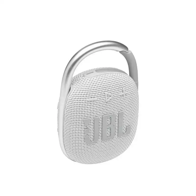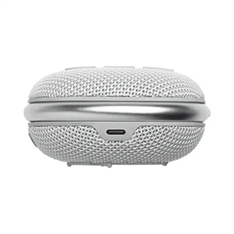 JBL Clip 4 Silver produces rich JBL Original Pro Sound via 40mm dynamic driver (100Hz-20kHz frequency response) from ultra-portable 239g cylindrical design. IP67 rating withstands full submersion (1m/30min), dust ingress, and floats on water; integrated carabiner clips to bags/backpacks. Bluetooth 5.1 streams wirelessly up to 10m with A2DP/AVRCP profiles; 3.885Wh Li-po battery delivers 10 hours playtime (3h recharge via USB-C); button controls manage playback/calls/volume.