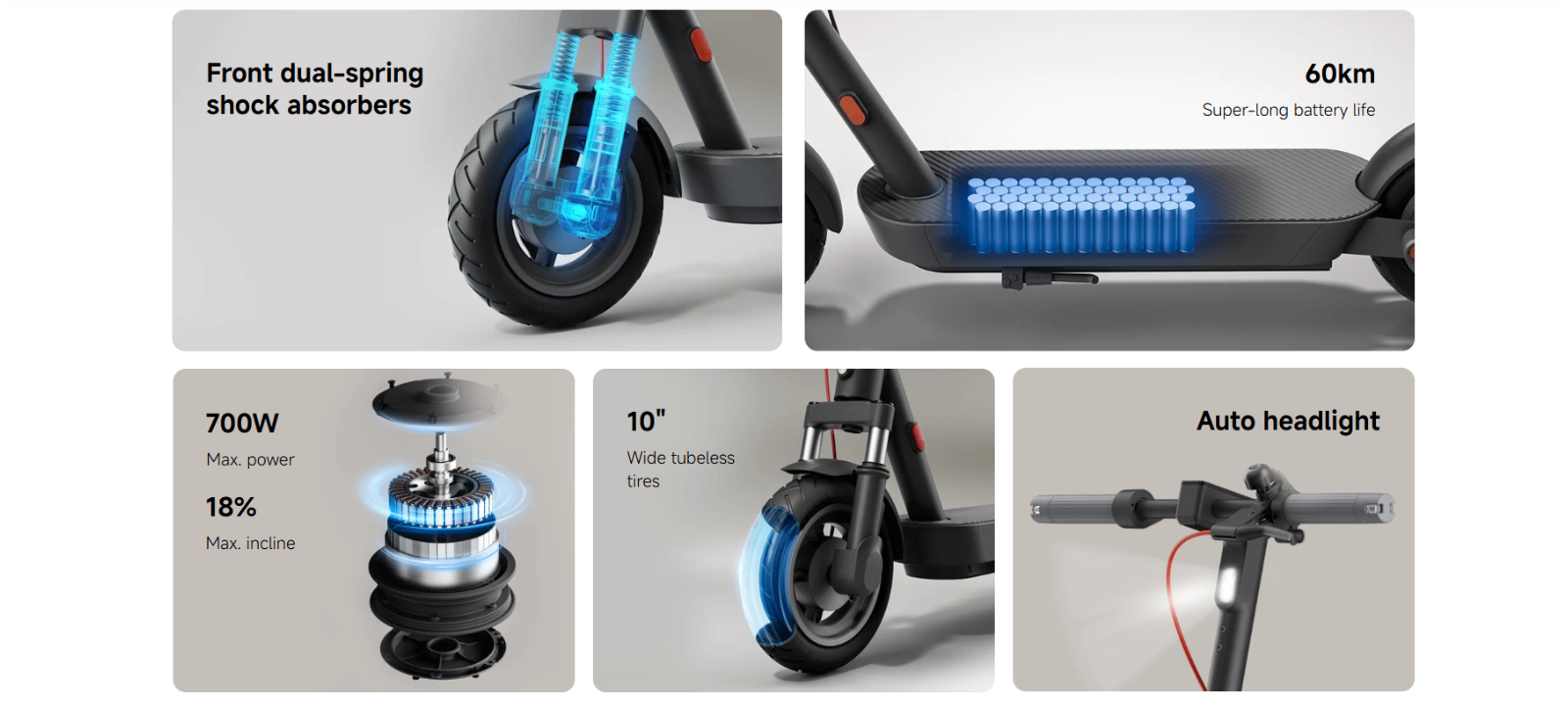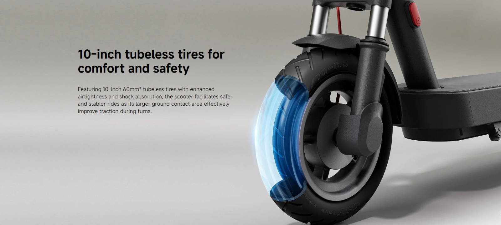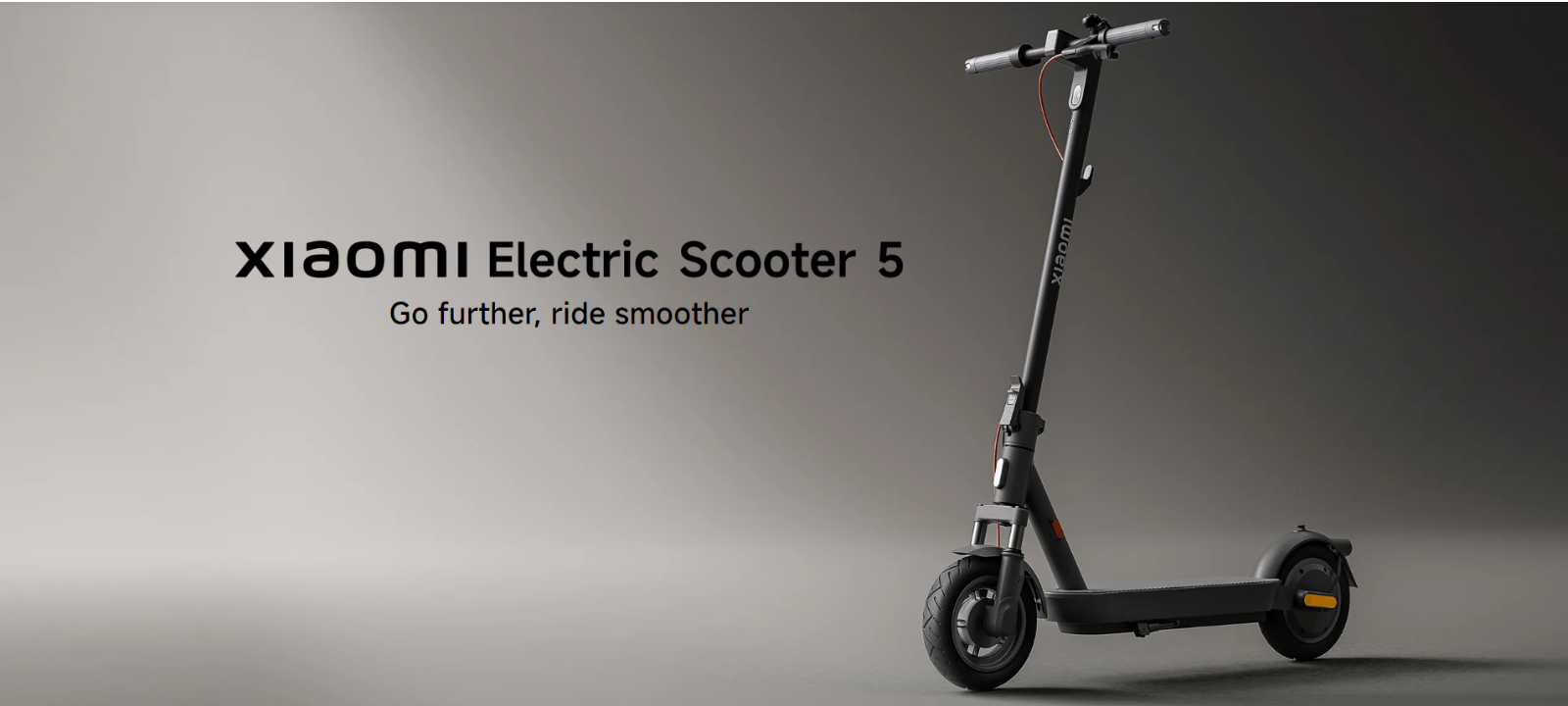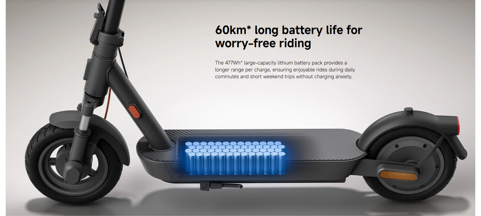 Xiaomi Electric Scooter 5 combines 350W rear-wheel drive motor with 477Wh battery delivering 60km range while front dual-spring suspension smooths cobblestones and 10″ tubeless tires enhance grip/traction. Three speed modes (6/20/25km/h) adapt to urban traffic with E-ABS + drum brakes stopping from 25km/h in under 4m. Folds to 58cm for metro storage with 18% hill climb capability and IPX5 water resistance for rainy commutes.