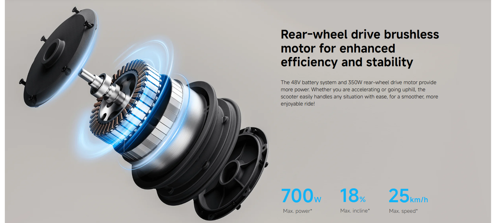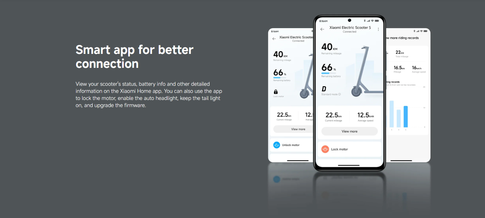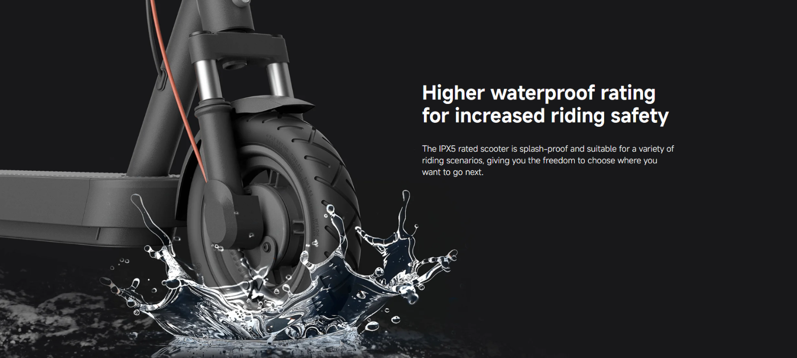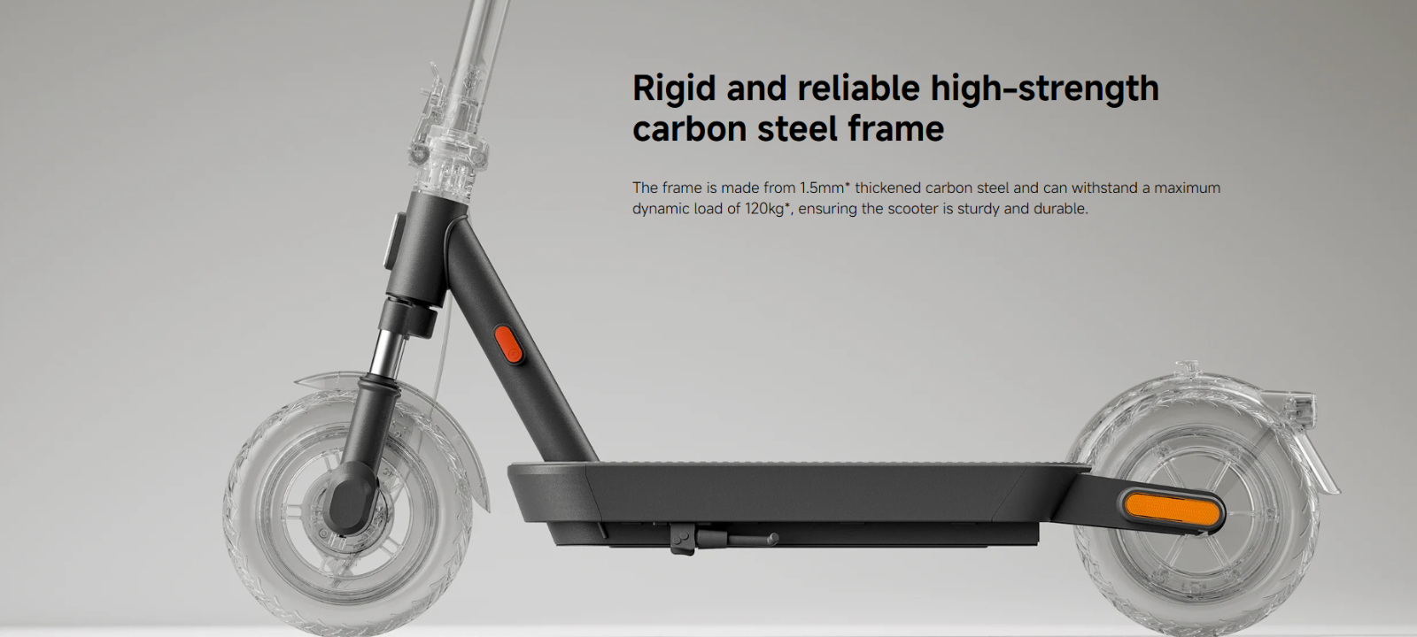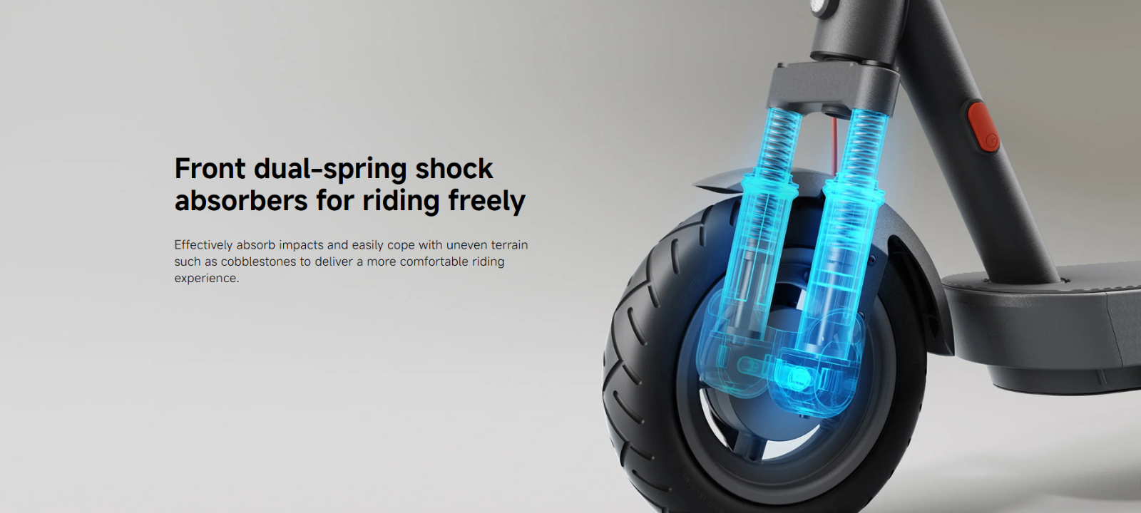 Xiaomi Electric Scooter 5 combines 350W rear-wheel drive motor with 477Wh battery delivering 60km range while front dual-spring suspension smooths cobblestones and 10″ tubeless tires enhance grip/traction. Three speed modes (6/20/25km/h) adapt to urban traffic with E-ABS + drum brakes stopping from 25km/h in under 4m. Folds to 58cm for metro storage with 18% hill climb capability and IPX5 water resistance for rainy commutes.