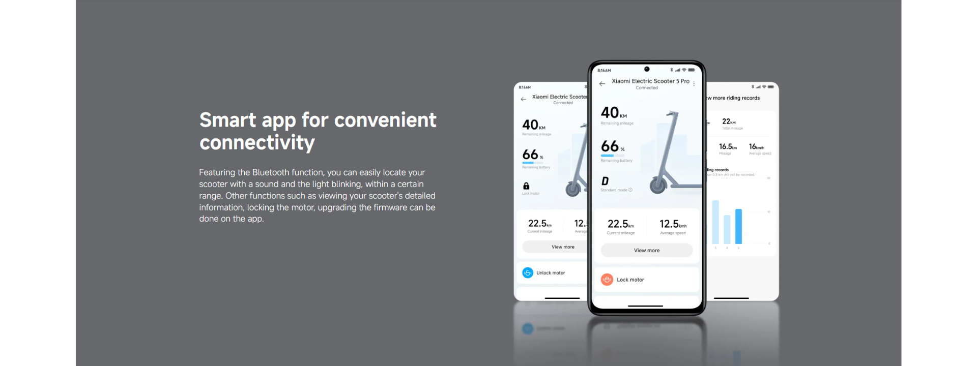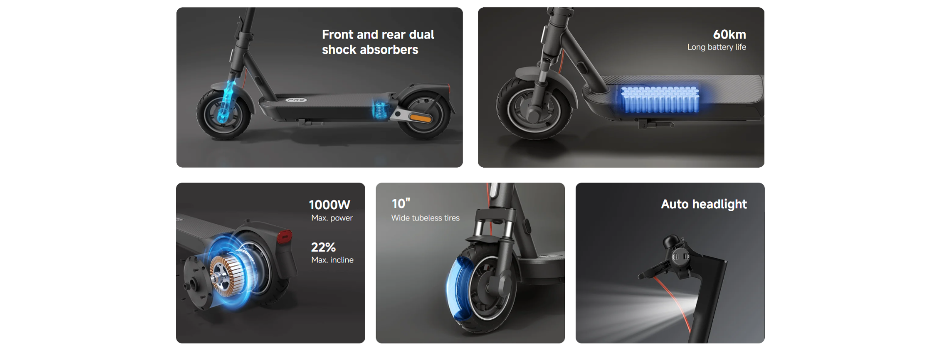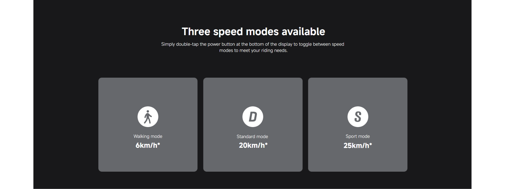 *Walking mode: 6km/h. Standard mode: 20km/h. Sport mode: 25km/h. Carrying a load of 75±5kg and charged to 70%±10% power in an environment with a temperature of 25±5℃ and a wind speed of ≤3m/s, the scooter accelerated in an auxiliary driving area, maintaining its maximum speed on reaching the test area. The highest speed in the test area was measured by a speedometer or Bluetooth and the dashboard. Data comes from the manufacturer.