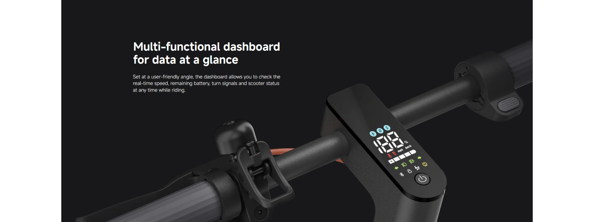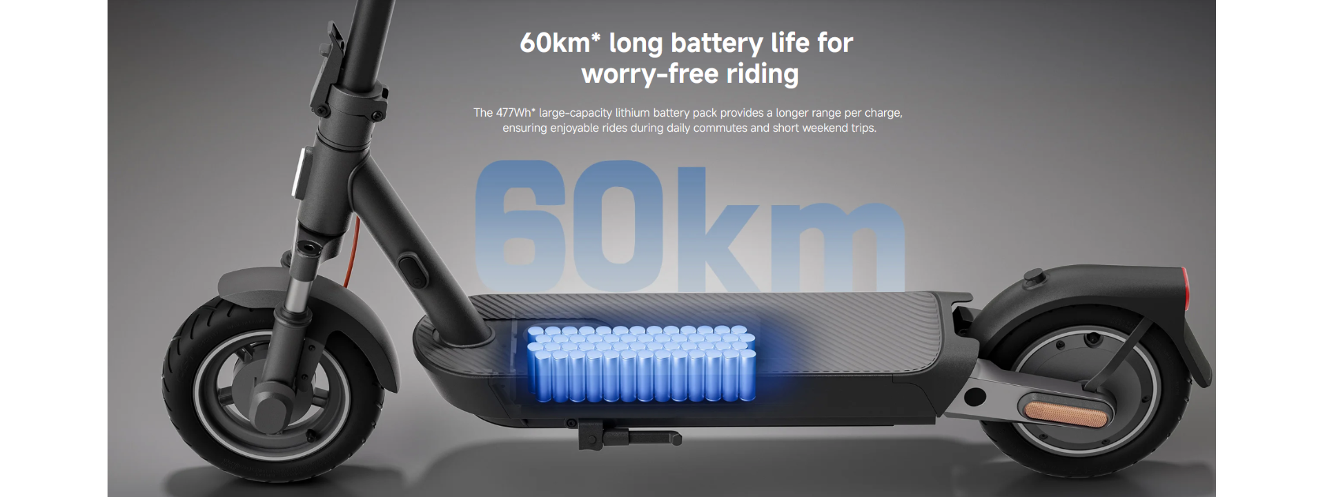 *60km range: Using the scooter’s official adapter to charge it, the scooter was considered fully charged when the indicator light on the adapter turned green. The scooter was then loaded with 75±5kg and driven at an average speed of 15km/h on a flat road in an environment with an ambient temperature of (25±5)℃ and a wind speed of ≤3m/s until the scooter speed dropped significantly and could not be driven again. Data comes from TIRT. Report number: OTA1-202403483.