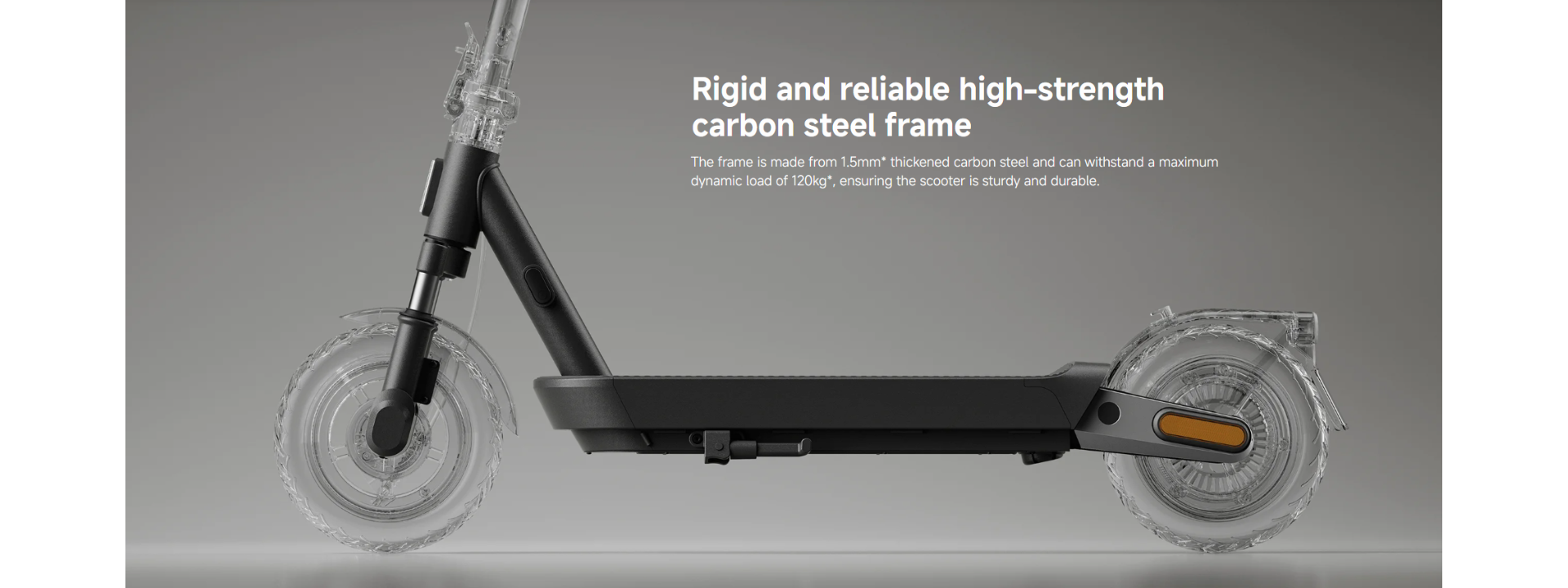 *120kg dynamic load: The scooter was tested on real roads for 3,000km by a tester weighing 120kg. Inspection requirements and standards: The whole vehicle has no functional damage, and structural and plastic parts have no cracks or breakages. Data comes from the manufacturer.