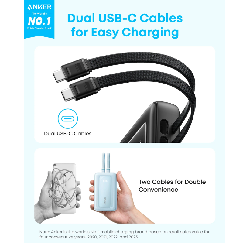 باور بانك ANKER ZOLO 10000 USB-C كابلات مدمجة أبيض يقدم شحناً بدون كابلات لمنسقي التوصيل التجاري بالقاهرة لتشغيل إنفينيكس نوت 50S وسامسونج A36 أثناء مسارات 12 ساعة. كابلين USB-C مدمجين مع 30 واط PD يشحن 50% في 25 دقيقة مع منفذ USB-C وUSB-A لشحن 3 أجهزة متزامن في تصميم 218 جرام نحيف.
