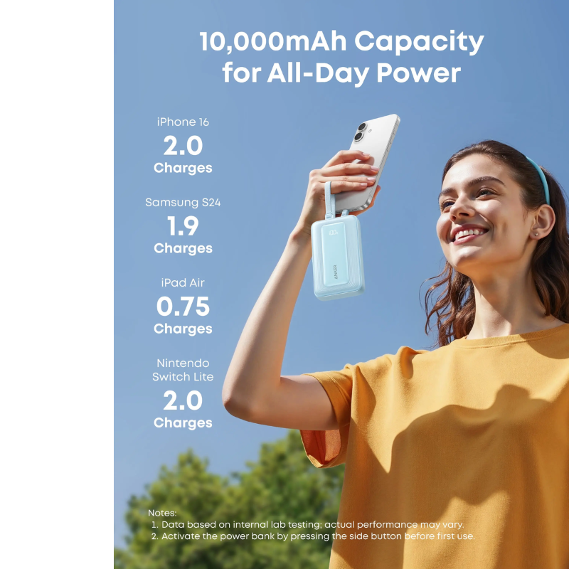 10000 مللي أمبير كثيفة؛ كابلين USB-C مدمجين؛ 30 واط PD USB-C؛ USB-A 18 واط؛ شاشة LED؛ 10,000+ ثنية؛ شحن 3 أجهزة؛ شحن عابر؛ 218 جرام مدمج.
