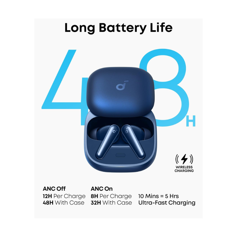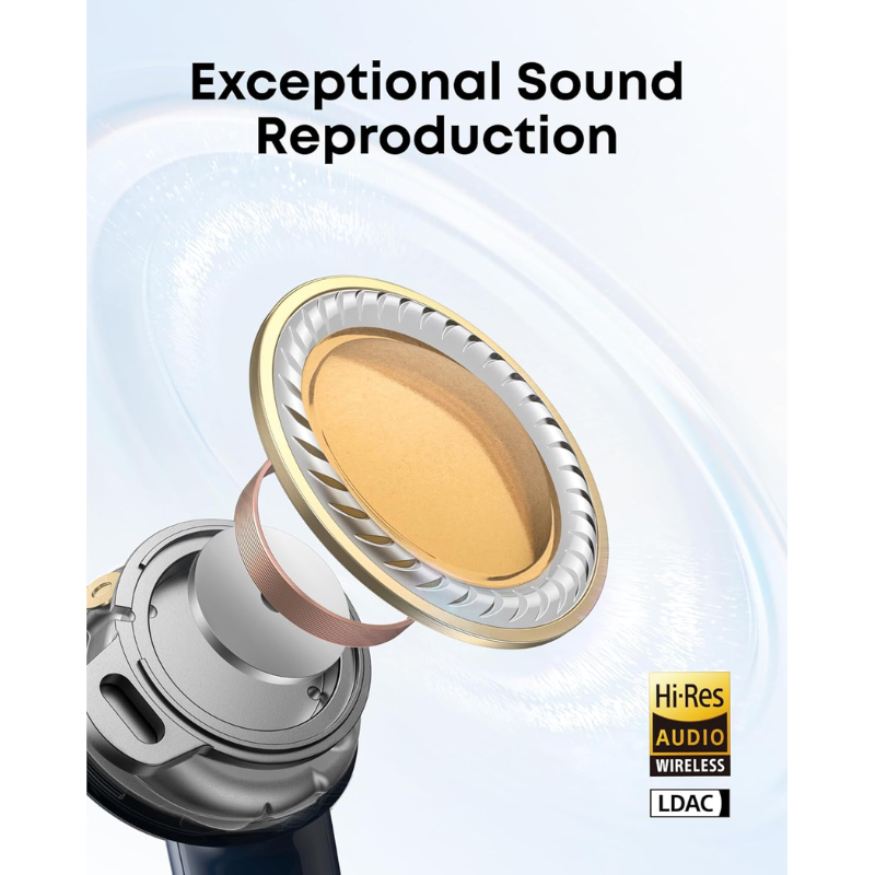 سماعة أنكر ليبرتي 5 أزرق بـAdaptive ANC 3.0 يعدّل كل 0.3 ثانية يقلل الأصوات البشرية 2x بتجويف صوتي مصمم مع درايفر صوفي-ورقي 9.2 مم Hi-Res LDAC وسط/باس قوي Dolby Audio مكاني. 6 ميكروفونات AI مقاومة رياح مكالمات صافية في زحمة القاهرة وبلوتوث 5.4 ثنائي. IP55 ماء وشحن 10 دقائق = 5 ساعات.