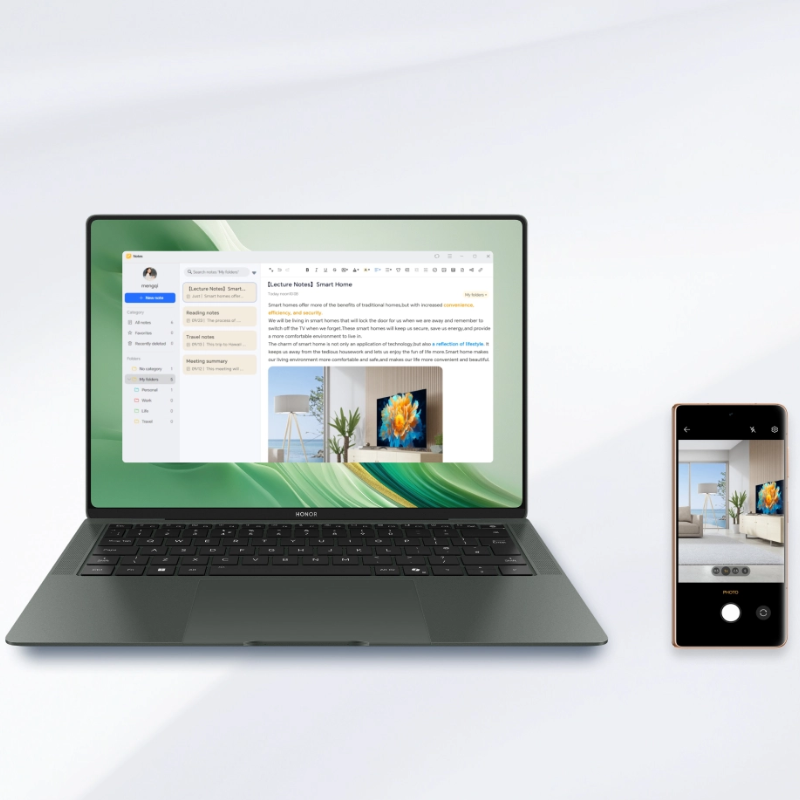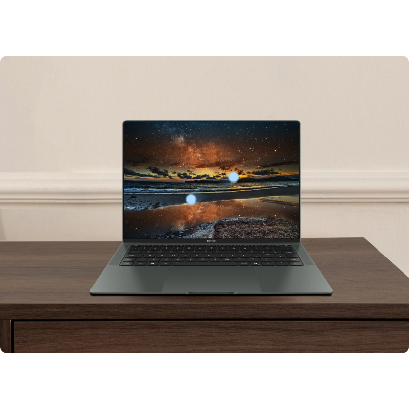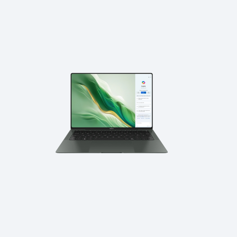 لابتوب هونر ماجيك بوك آرت 14 إزميرالد جرين بشاشة OLED لمس 14.6 إنش نسبة 3:2 (3120×2080، 120 هرتز، 700 نيت HDR10، 100% DCI-P3) معتمدة TUV للراحة البصرية، مدعوم معالج إنتل كور ألترا 7 (16 نواة، جرافيكس Arc) مع 32 جيجا LPDDR5X رام و1 تيرا PCIe Gen4 SSD لتحرير فيديو/تحليل SQL سلس. منفذين ثندرbolt 4، HDMI 2.1، WiFi 7، بصمة زر التشغيل؛ تبريد vapor chamber هادئ 35 ديسيبل. غطاء كاميرا مغناطيسي، هيكل ألومنيوم 1.03 كجم، بطارية 60 واط ساعة 8 ساعات مع 100 واط شحن.