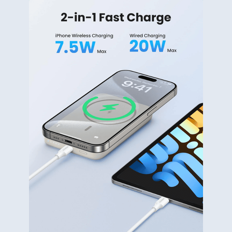 جهازين متزامن؟ 7.5 واط لاسلكي + 20 واط USB-C مستقلين.