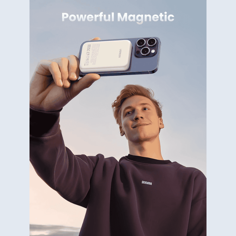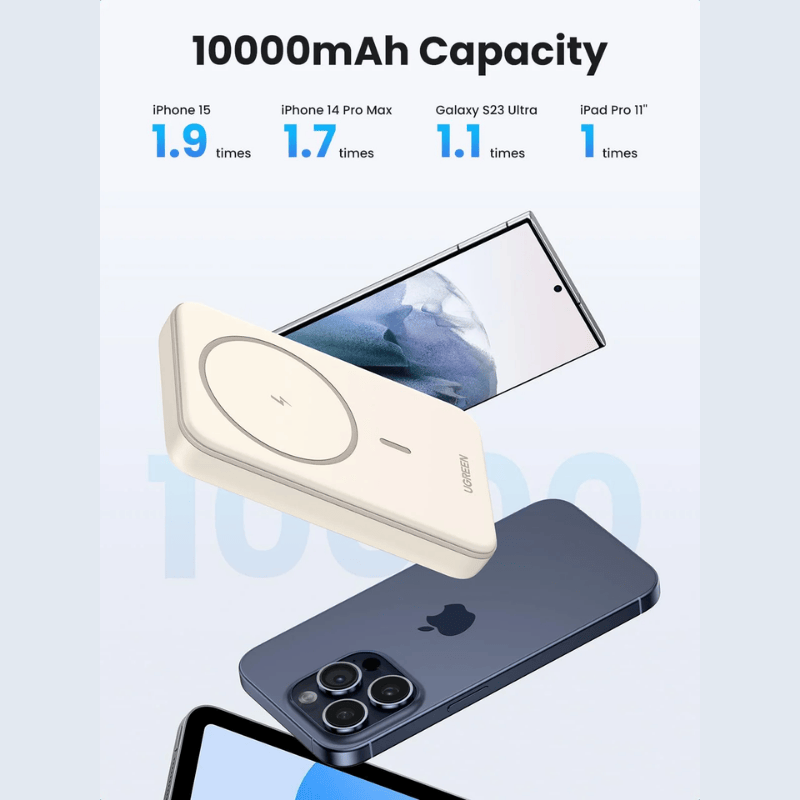 باور بانك يو جرين 10000 مللي أمبير يلتصق بآيفون 12-17 بشحن لاسلكي 7.5 واط مغناطيسي قوي N52 بينما USB-C PD 20 واط يشحن جالاكسي S25 أو جهاز ثاني يدعم 1.9 شحنة كاملة لآيفون 15 برو ماكس. شاشة LCD تعرض البطارية والسرعة والحرارة مع شحن ثنائي PD 20 واط في 3.5 ساعات. تصميم 220 جرام مريح مع 37 واط ساعة آمن للطيران.