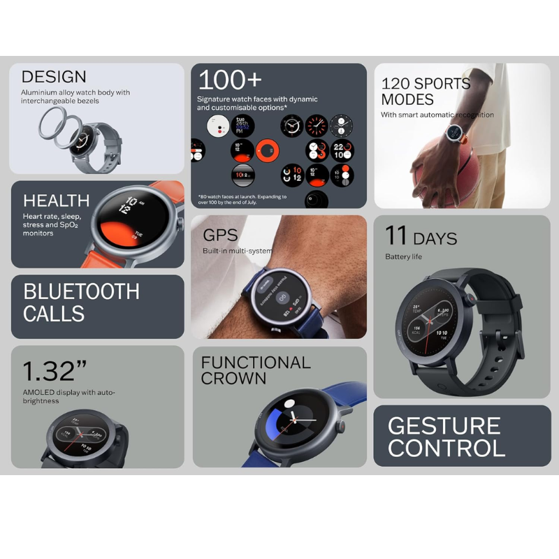 ج: 1.32″ AMOLED 466×466، 353 PPI، 620 نيت، 60Hz.