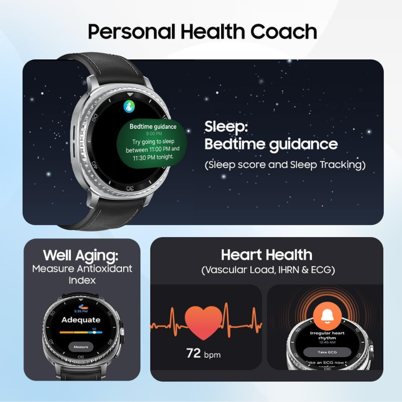 رؤية ضوء القاهرة؟ AMOLED 3000 نيت مقروء خلال ساعات الذروة. تغطية أسبوع كاملة؟ بطارية 40 ساعة تغطي ورديات متعددة. مراقبة صحية مؤسسية؟ ECG/ضغط/مضادات أكسدة مستمرة. متانة مواقع البناء؟ MIL-STD-810H يتحمل ظروف المستودعات. تكامل Galaxy؟ تبديل تلقائي + تحسين النظام.