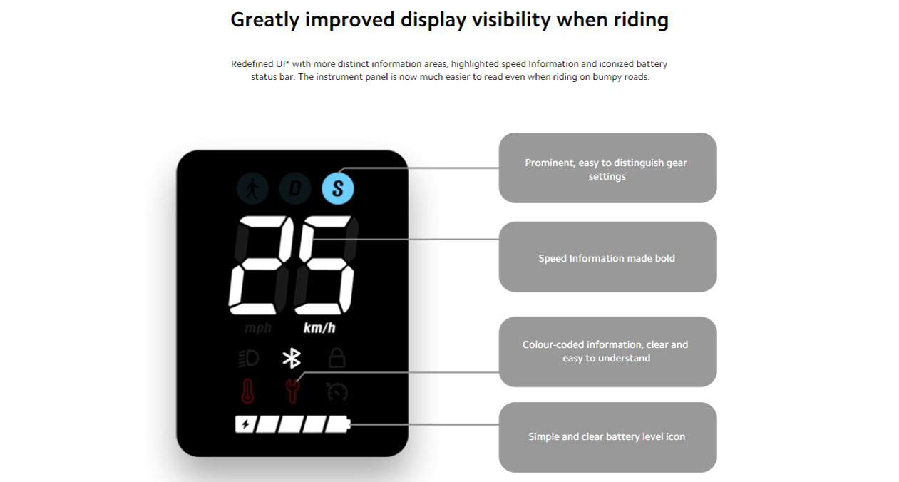 السرعة القصوى؟ 25 كم/ساعة رياضي (قانوني). مدى التنقل اليومي؟ 20 كم شحنة واحدة. قدرة صعود؟ 14% ميل. وقت الطي؟ 3 ثواني نقل. الحمل؟ 100 كجم أقصى.