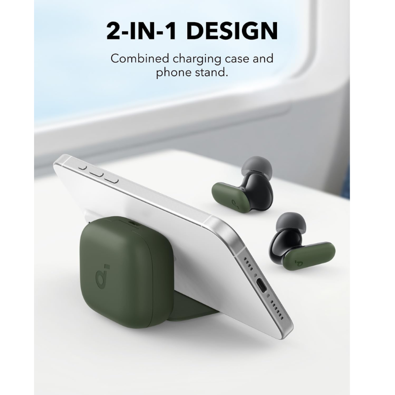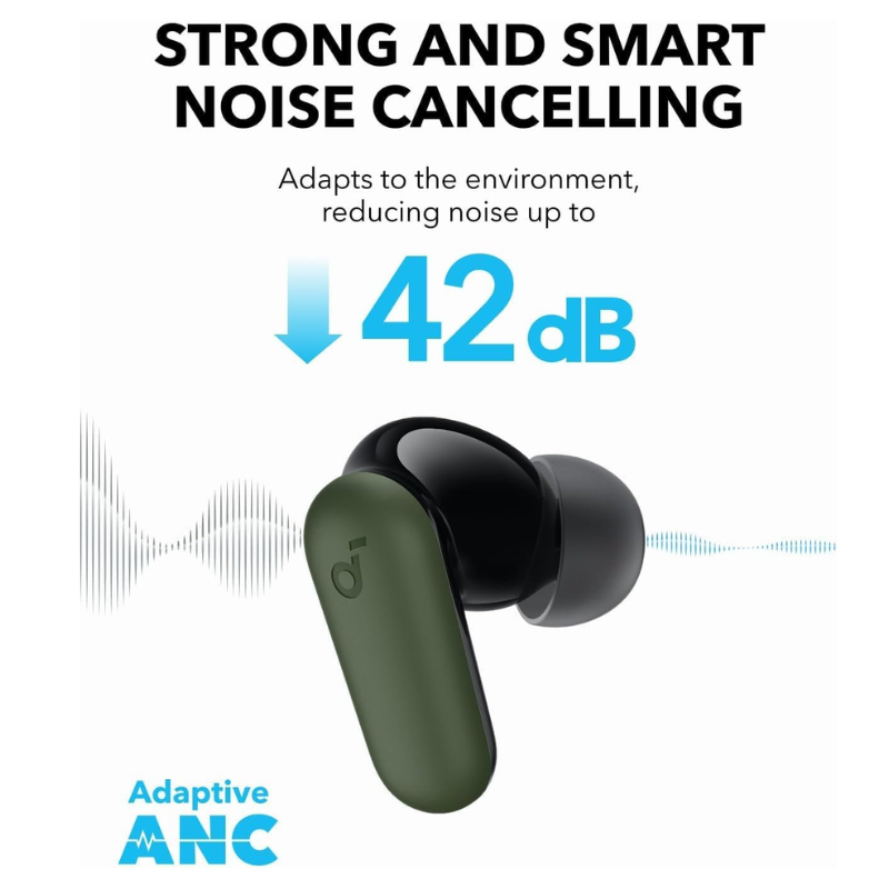 سماعة أنكر ساوندكور R50i NC أخضر بـANC تكيفي يراقب البيئة لحجب 42 ديسيبل منزل/مكتب/تنقل مع درايفر 10 مم BassUp مثالي لميكسات EDM القاهرة. 4 ميكروفونات AI مكالمات موردين صافية مرور وبلوتوث 5.4 ثنائي هاتف/لابتوب. IP54 عرق مع علبة 2ف1 حامل فيديو مراجعات.
