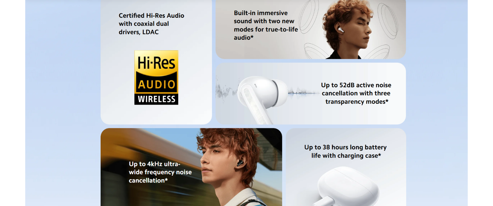 قوة ANC؟ 52 ديسيبل هجين مع تغطية 4 كيلوهرتز. عمر البطارية الإجمالي؟ 38 ساعة مع العلبة (10 ساعات ANC off). وضوح مكالمات الرياح؟ 3 ميكروفون AI يقاوم 9 م/ث. صوت Hi-Res؟ ترميز LDAC بـ24 بت/96 كيلوهرتز. شحن سريع؟ 5 دقائق = 2 ساعة تشغيل.