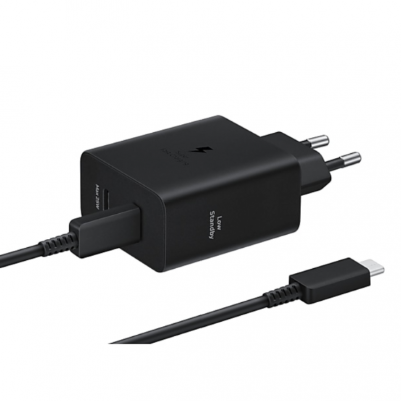 شاحن سامسونج Type-C سوبر فاست 50 واط (1.8 متر) أسود يقدم 50 واط Super Fast Charging 2.0 عبر USB-C1 (PPS 3.3-21V/2.25A) و25 واط USB-C2 معاً، شحن كامل جالاكسي S25 ألترا في 65 دقيقة مع تشغيل تكنو سبارك 30C. كابل USB-C منسوج 1.8 متر يتحمل إساءة تاكسيات القاهرة أفضل من العادي، يدعم PD لهونر ماجيك 7 برو بسرعات قوية. تصميم منفذين يشغل A56 + علب هواوي فريبودز برو 4 في عروض Ehab Group، شريحة IC ذكية توزع الطاقة (50 واط واحد/75 إجمالي). حماية شاملة للاستخدام الليلي مع باور بانكات يو جرين PB312. تصميم أسود مدمج يناسب إعدادات ماكسكو 65 واط مع تحسين PPS لفيفو V50.