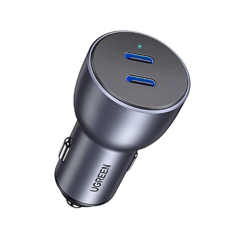 • شاحن سيارة UGREEN EC213 / CD213 50W Dual USB‑C PD Car Charger – لون رمادي/أزرق داكن حسب النسخة.