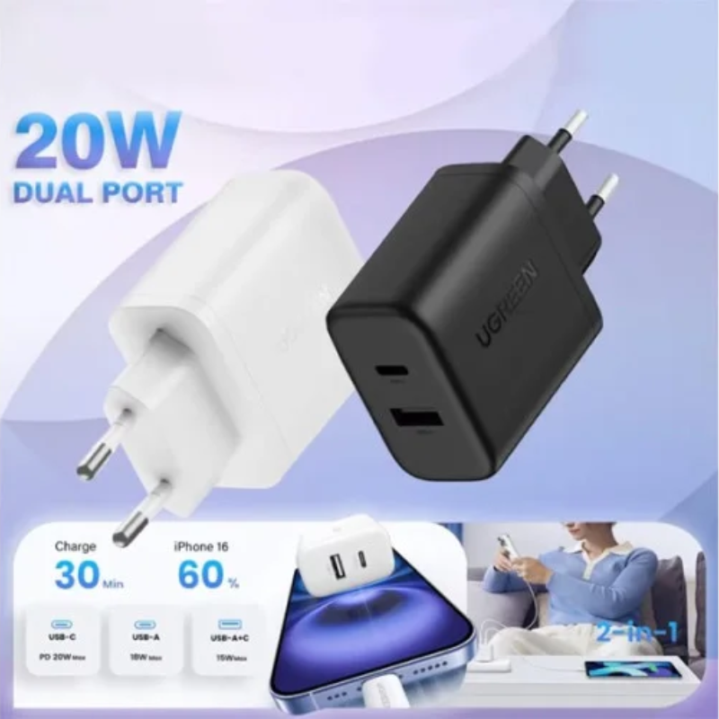 منفذ USB‑C يدعم حتى 20W PD3.0 لشحن هواتف مثل آيفون وأندرويد بسرعة، مع منفذ USB‑A حتى 18W (QC وغيرها) بمجموع قدرة 20W إجمالي.