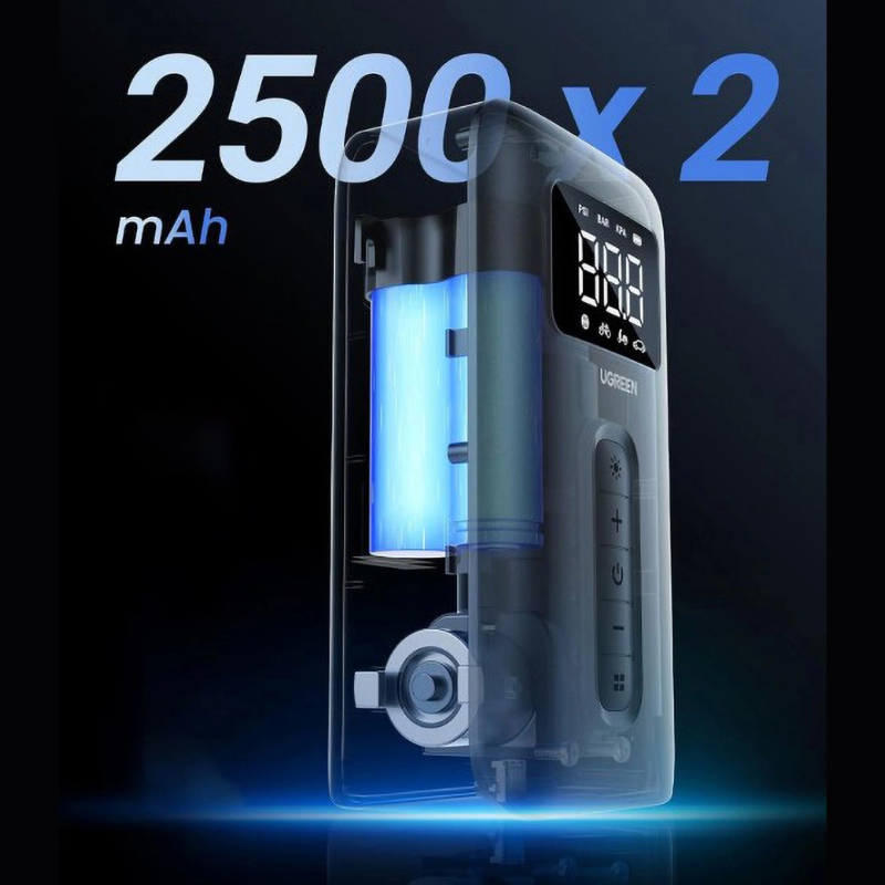 يعمل بسعة 2×2500mAh (حوالي 5000mAh)، ويقدر ينفخ تقريباً حتى 12 إطار سيارة صغيرة من 20 إلى 36 PSI بشحنة واحدة، بدون الحاجة لولاعة العربية أو فيشة.