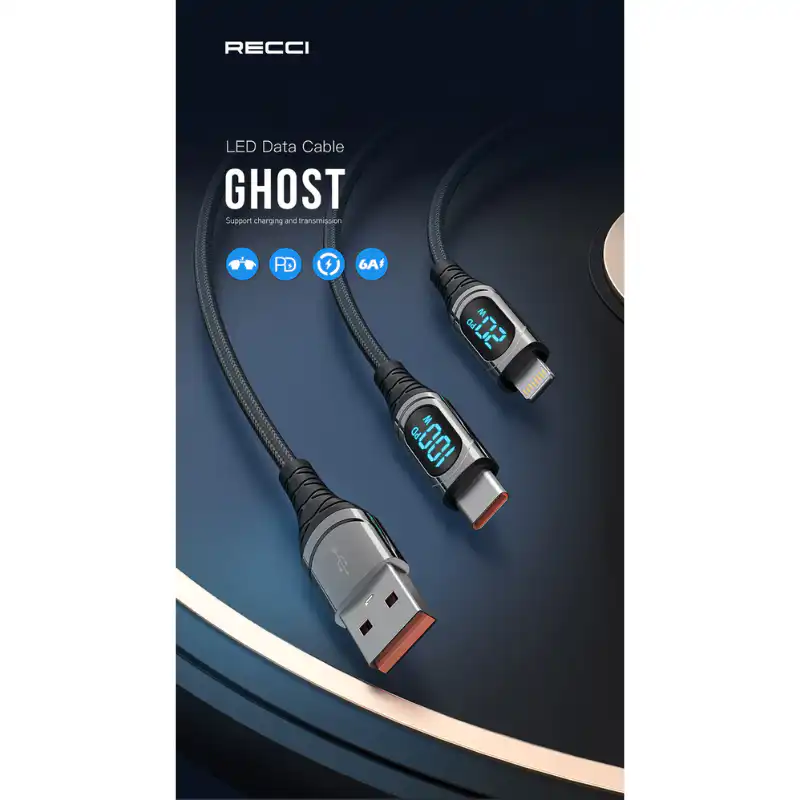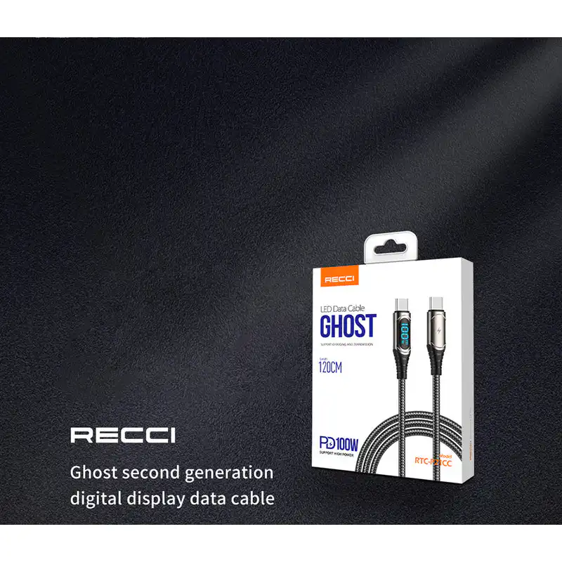 The Recci RTC-P21CC Type-C to Type-C cable supports 100W Power Delivery fast charging, capable of powering laptops, tablets, and smartphones at maximum speeds up to 20V/5A. Its built-in LED display shows real-time charging wattage and current for monitoring power flow, while USB 2.0 data transfer handles 480Mbps speeds for quick file syncing. Durable nylon braided construction resists tangling and wear, with reinforced connectors ensuring over 10,000 bends for long-lasting reliability during daily use.
