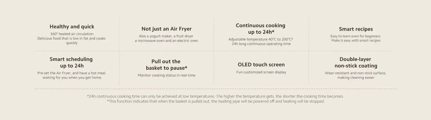 This air fryer transforms weeknight dinners with quick air-fried chicken wings, fries, or vegetables ready in 15 minutes using little oil for healthier family meals. Busy parents preheat it remotely via app for hot meals waiting after work, while health-conscious users make yogurt overnight at constant 40°C or dry fruits for snacks. Weekend bakers create egg tarts or cakes with precise temperature control, and beginners follow guided smart recipes on the OLED screen. Travelers or small households appreciate the 3.5L capacity for single servings, while dieters enjoy low-fat alternatives to deep frying. Perfect for daily healthy cooking, meal prep, baking, and snack making without oil mess.